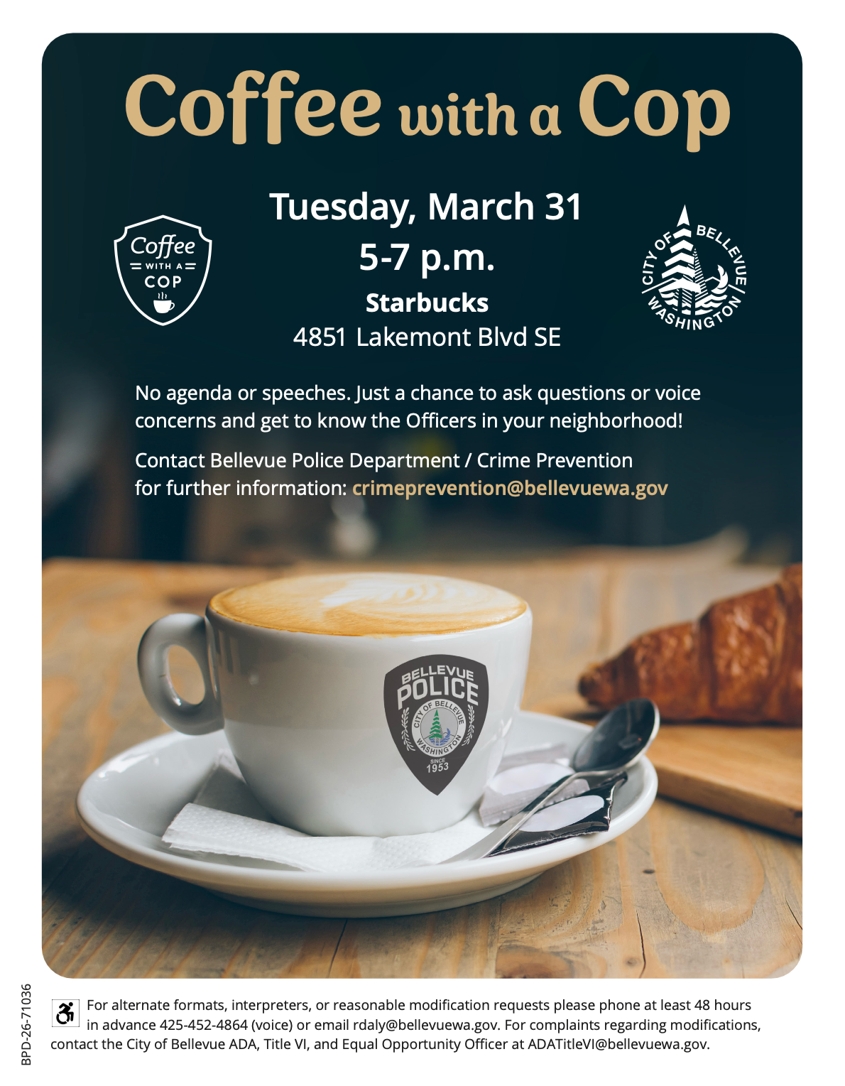 Back to All Events Coffee with a cop Monday, March 30, 2026 5:00 PM 7:00 PM Google Calendar ICS Join the Bellevue Police Department for "Coffee with a Cop"! Due to popular community demand for an evening gathering, officers will be available for an after-work meetup to connect with the neighborhood.